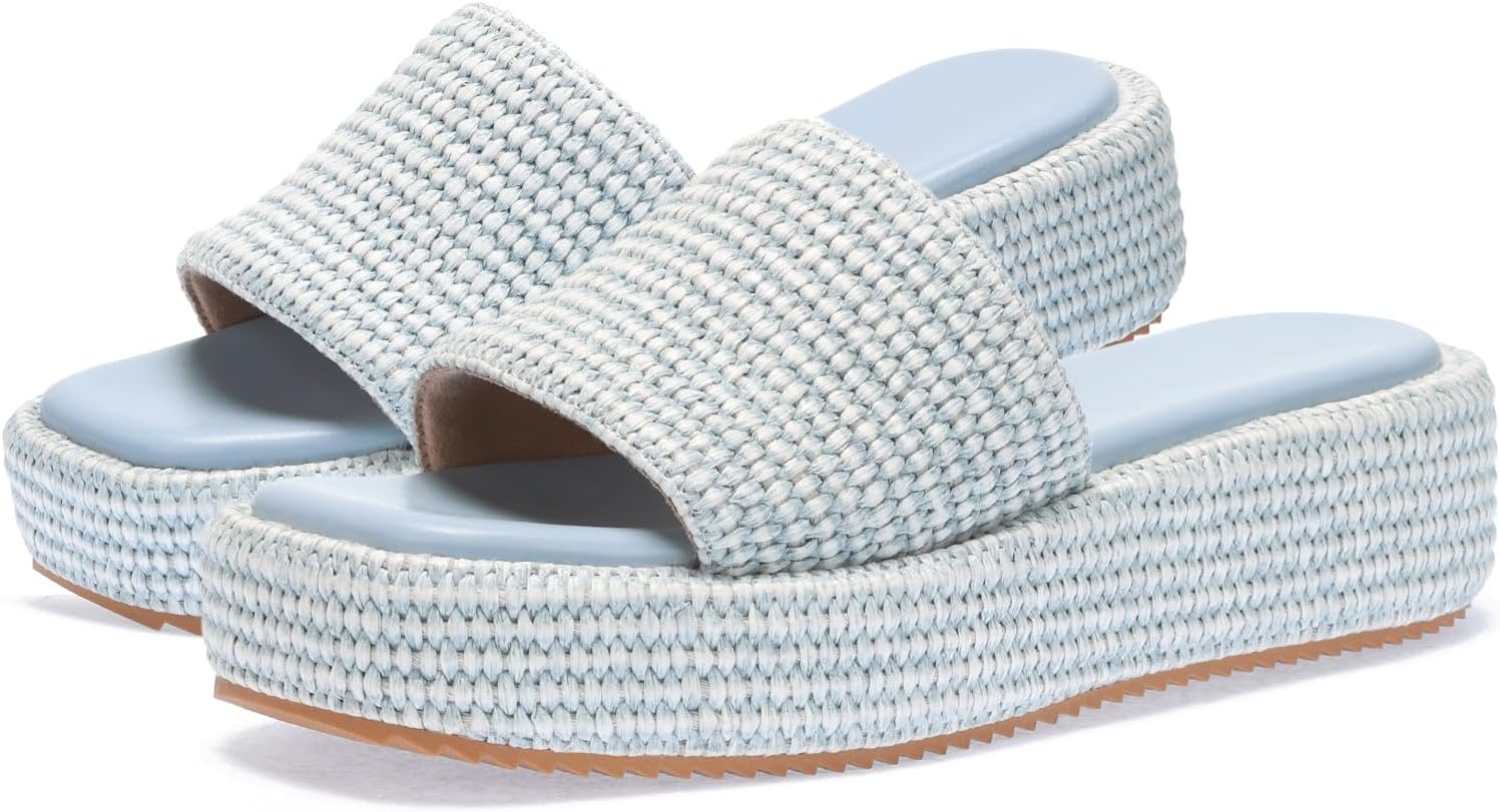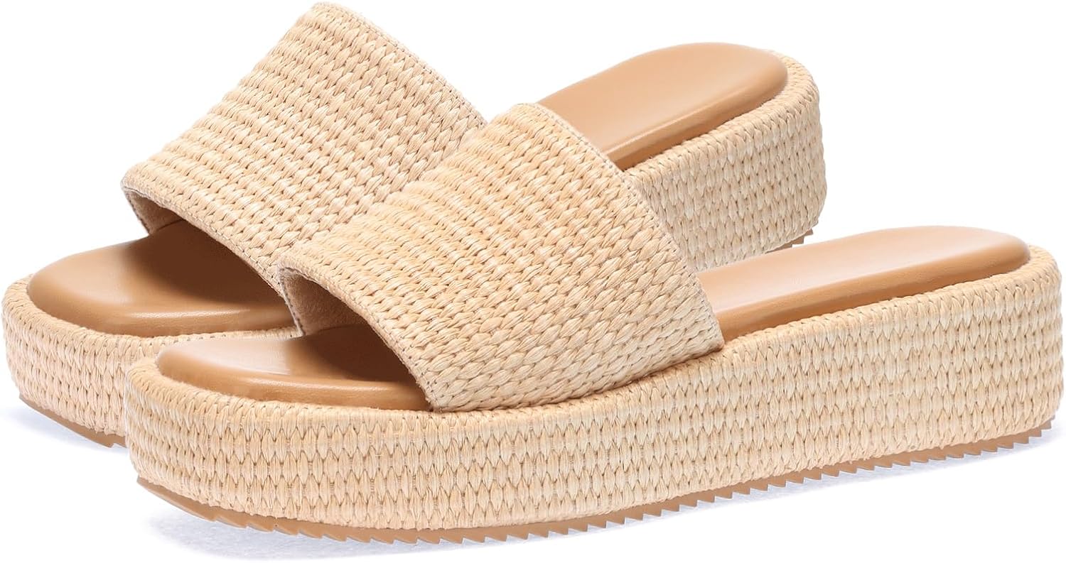 Monrovia Platform Sandals Women Raffia Wicker Espadrilles, Slip On Low Wedge Slides, Summer Straw Vacation Shoes, Comfortable Rattan Platform Flats Beach Sandals Pool Daily Wear